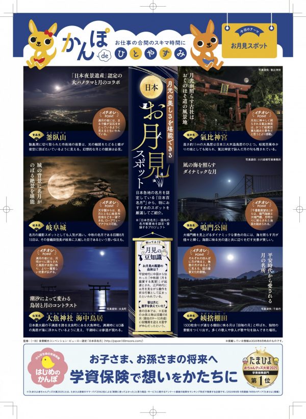 「日本百名月」かんぽ生命保険チラシ 監修協力 ○お客様/ぴあ株式会社、かんぽ生命保険様 かんぽ生命保険チラシと「日本百名月」のコラボレーション企画に伴う協力を行いました。「日本のお月見」をテーマに監修名月スポットを全国の郵便局にも設置されました。 Tweet