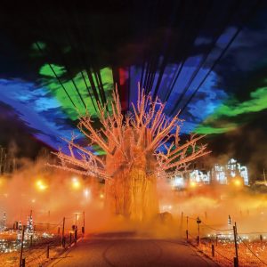 展望台の窓を巨大スクリーンに仕立て、展望台から見る夜景を背景に迫力ある映像と